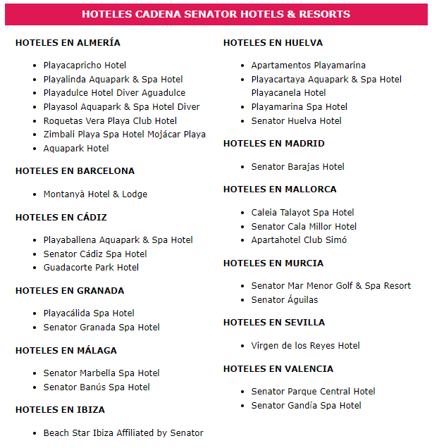 - Opción 2: Alojamiento en SENATOR HOTELS Y AFILIADOS a disfrutar hasta el 22/12/24, para 2 adultos.