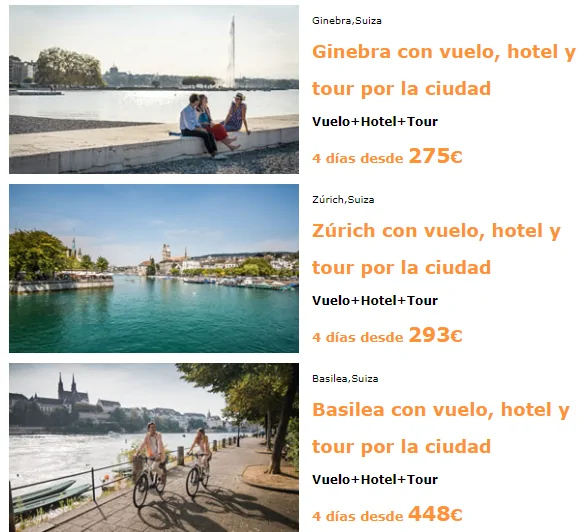 | Suiza ofrece tal cantidad de atractivos turísticos y actividades, que existe una para cada tipo de viajero. Sean como sean tus clientes, sin duda alguna, las ciudades de Ginebra, Zúrich y Basilea les impresionarán. Ginebra. Esta ciudad cosmopolita combina a la perfección tradición y naturaleza. Uno de sus grandes imperdibles es el casco histórico, característico por sus calles empedradas, iglesias de piedra y ambiente medieval. En ella, además, se pueden visitar el Muro de los Reformadores y el Jardín Inglés, con el Reloj de Flores, el lago Lemán y unas espectaculares vistas de la fuente de Jet d’Eau, su símbolo principal. Zúrich. Los amantes de las tendencias encontrarán sumamente interesante Zúrich, urbe cosmopolita aparte de corazón financiero helvético. A nivel gastronómico, disfrutarán de una excelente oferta, con una atención especial a las propuestas vegetarianas. También podrán explorar barrios de moda como el Zürich-West, que muestra a las claras el espíritu más mundano y sofisticado de la ciudad. Esta antigua zona industrial, aloja ahora muchas atracciones para el visitante, como la Torre Prime o el Viaducto del ferrocarril, cuyos 36 arcos cobijan un buen número de tiendas, bares y restaurantes. Basilea. Presume de ser una de las ciudades más hermosas de Suiza y razones no le faltan. Su casco antiguo medieval, de los mejor conservados de Europa, es una maravilla, equiparable al tesoro cultural de sus 40 museos, entre ellos el de Arte, que cuenta con varios Picasso. Pero esta capital de la cultura suiza posee otro gran atractivo, su moderna arquitectura, con un buen número de edificios obra de eminentes arquitectos con premio Pritzker, como la Torre Roche o el Vitra Design Museum. |