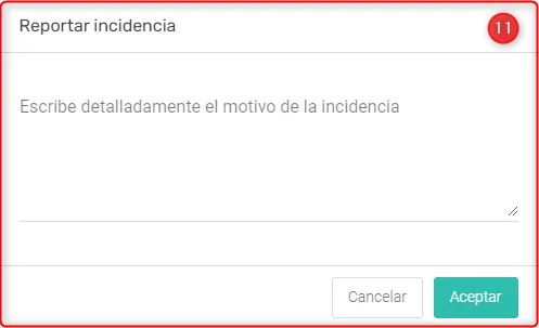 En el punto 11 cabe destacar que, a la hora de reportar alguna incidencia administrativa, os mostrará la ventana que se muestra a continuación donde podréis describir con detalle el motivo de la misma y de ésta manera la gestión llega directamente al Departamento de Administración, siendo así más rápido y efectivo que el chat o el mail.