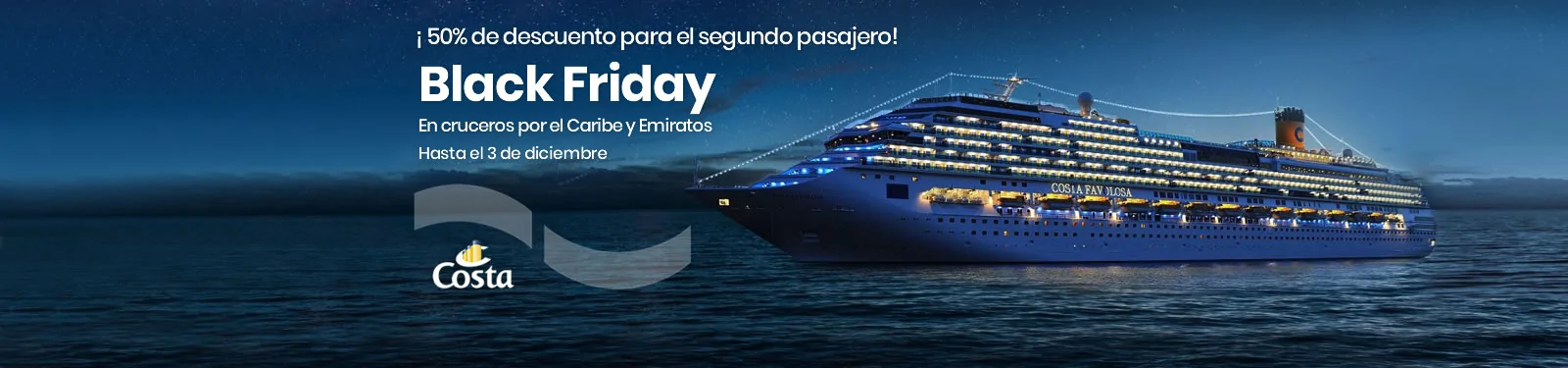 *Promoción válida para reservas realizadas entre el 21 de noviembre y el 3 de diciembre de 2019, para cruceros de 7 noches a bordo del Costa Diadema por los Emiratos Árabes 7 noches con embarque en los puertos de Abu Dhabi, Dubái o Doha y con salidas comprendidas entre el 07/12/19 y el 07/03/20 (ambos incluidos) y del Costa Favolosa por el Caribe 7 noches con embarque en el puerto de La Romana y con salidas comprendidas entre el 06/01/20 y el 16/03/20 (ambos incluidos). Descuento del 50% aplicable para el segundo pasajero sobre el precio del crucero o del paquete crucero+vuelo contratado con Costa.