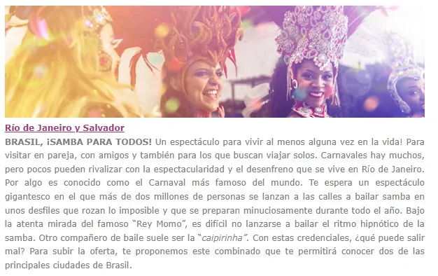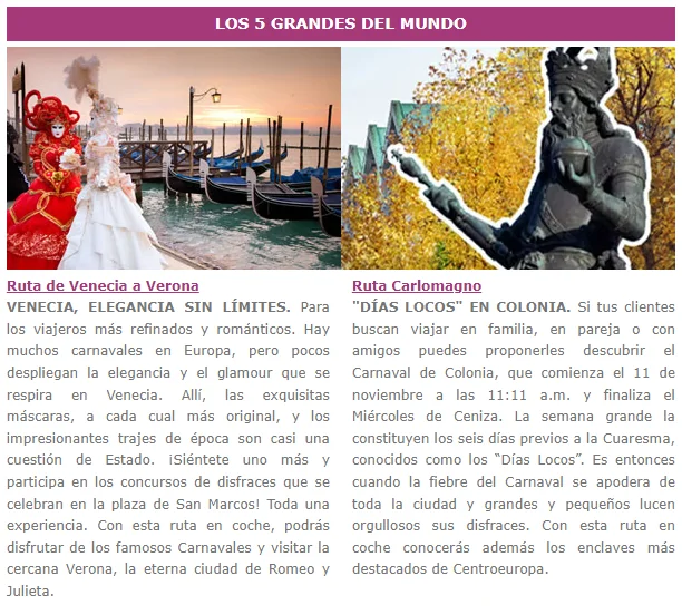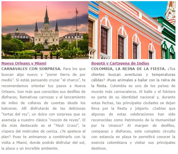 La letra de la mítica canción de Celia Cruz bien podría sonar así… Porque viajar en Carnaval abre la mente. Nos encontramos ante una de las festividades más divertidas del año. Quizás tus clientes tengan «ganas de fiesta», pero no se deciden. Acompáñanos por las celebraciones más importantes del mundo. Te proponemos los mejores viajes, que compaginan las fiestas carnavaleras con otros planes y lugares. Pronto sentirás ¡qué la vida es un carnaval!.
