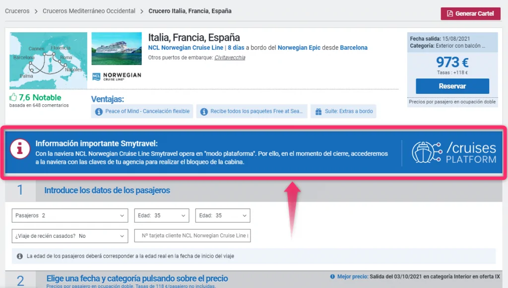 IMPORTANTE: realizando el bloqueo en smytravel utilizando /cruisesPLATFORM, … la relación comercial, pagos y post-venta es directa entre tu agencia y la naviera.