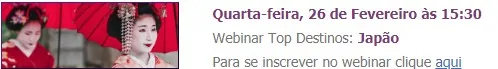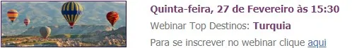 Durante as próximas semanas programamos vários webinars nos quais centraremos atenções nos nossos destinos TOP para este ano de 2020. Os destinos são: Japão, Turquia, Cuba, Itália, Jordânia, Argentina e Marrocos.